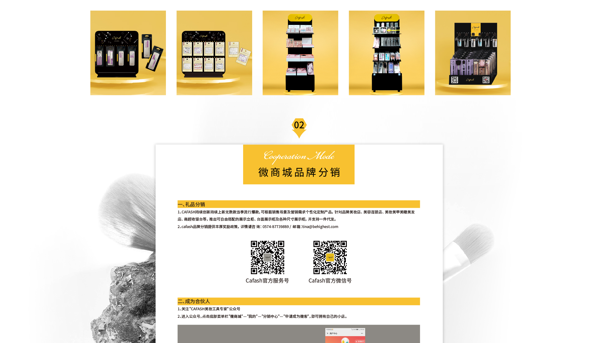 主營産品 禮贈品套裝化(huà)妝品配件(jiàn) 發廊及發飾美(měi)甲&修指甲&足療配件(jiàn)沐浴美(měi)容SPA 聯系我們 生(shēng)産商:上海柔仕個人護理用品有限公司 電(diàn)話(huà):+0086-0574-87177566 郵箱:sales2@cafash.com.cn tina@behighbeauty.com